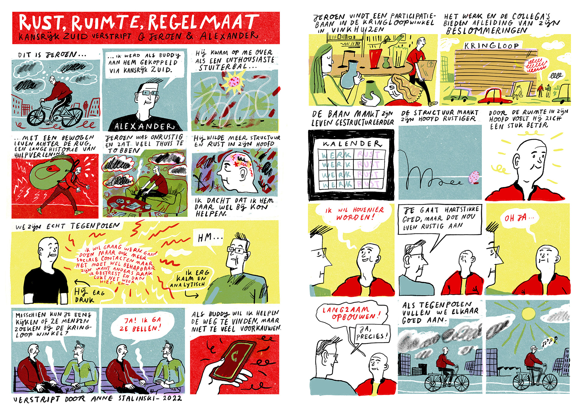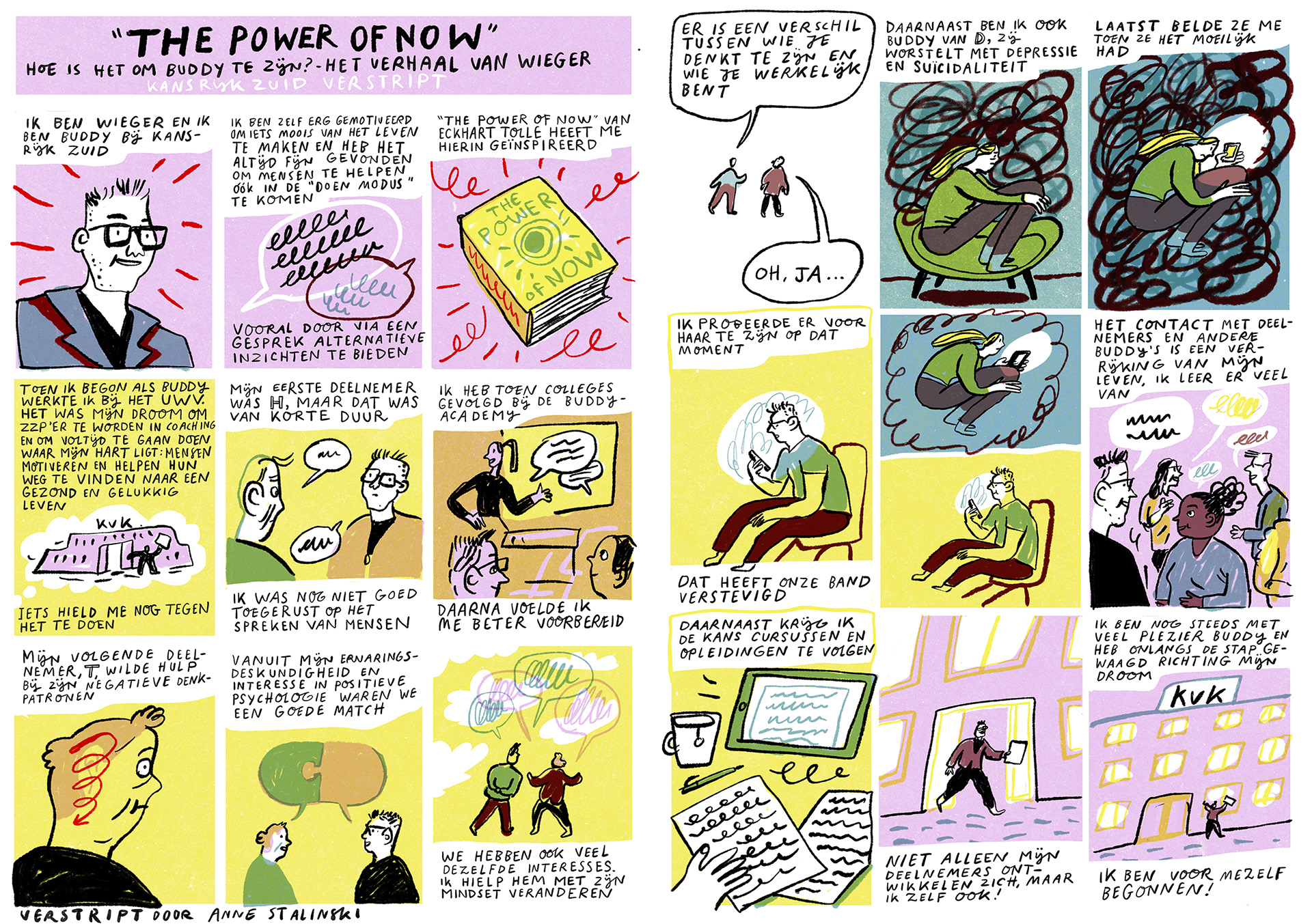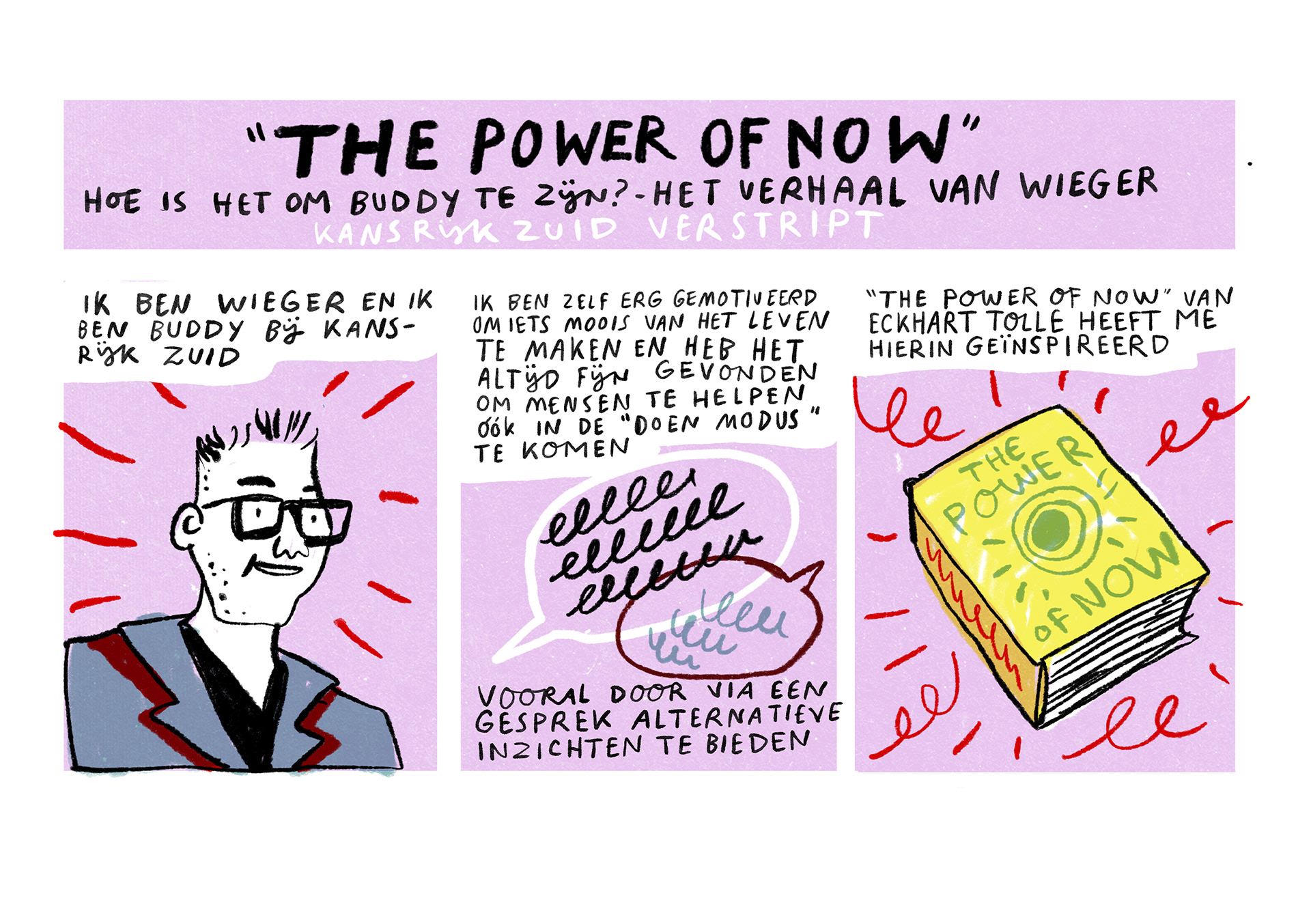 Het project "Kansrijk Zuid" koppelt mensen met 'een afstand tot de arbeidsmarkt' aan Buddy's die hen helpen bij zaken waar ze tegenaan lopen. Een sympathiek en sociaal project van de Gemeente Groningen. Ik werd gevraagd een vijftal ervaringen van zowel deelnemers als buddy's te verstrippen, om zo inzicht te geven in het succes én de moeilijkheden van dit project. Het leverde heel verschillende strips op.