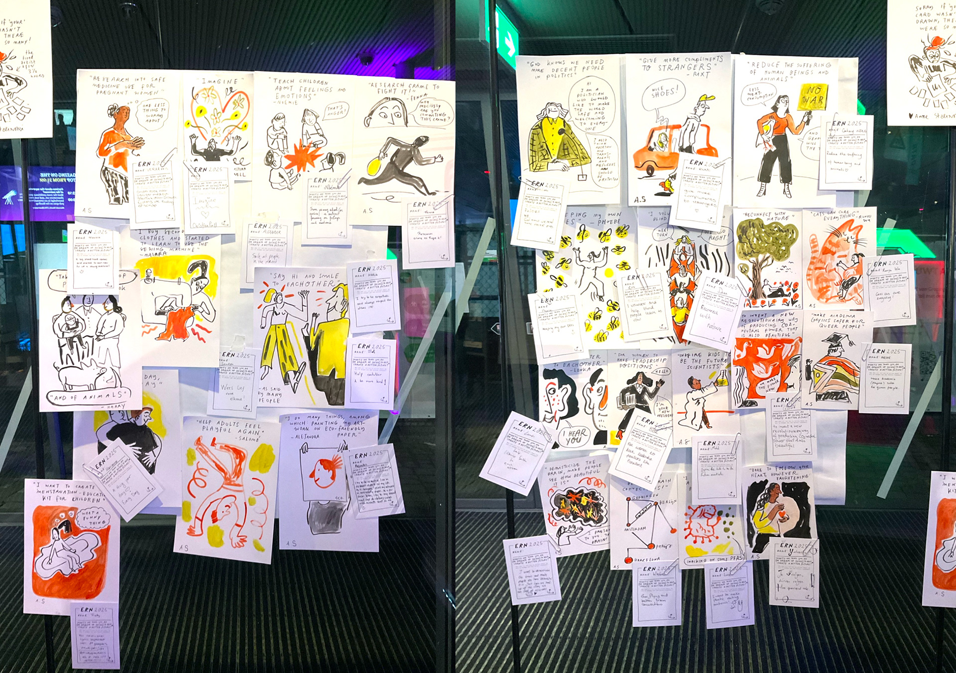 Tijdens de European research night, tekende ik input van het publiek. Er werden kaartjes uitgedeeld, met de vraag: What's one thing you do (or dream of doing) to help create a better future?